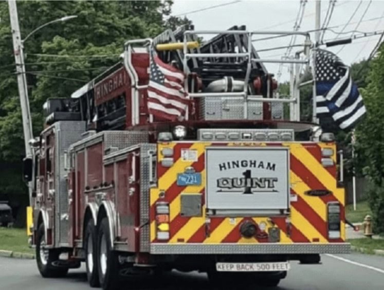 You’ll notice the thin blue line flag on the truck, which commemorates police officers who died in the line of duty. Hingham borders Weymouth, the city where Sgt. Michael Chesna was murdered by an unarmed person of color two years ago. To honor his sacrifice on the anniversary of that horrific event this is what HFD does.